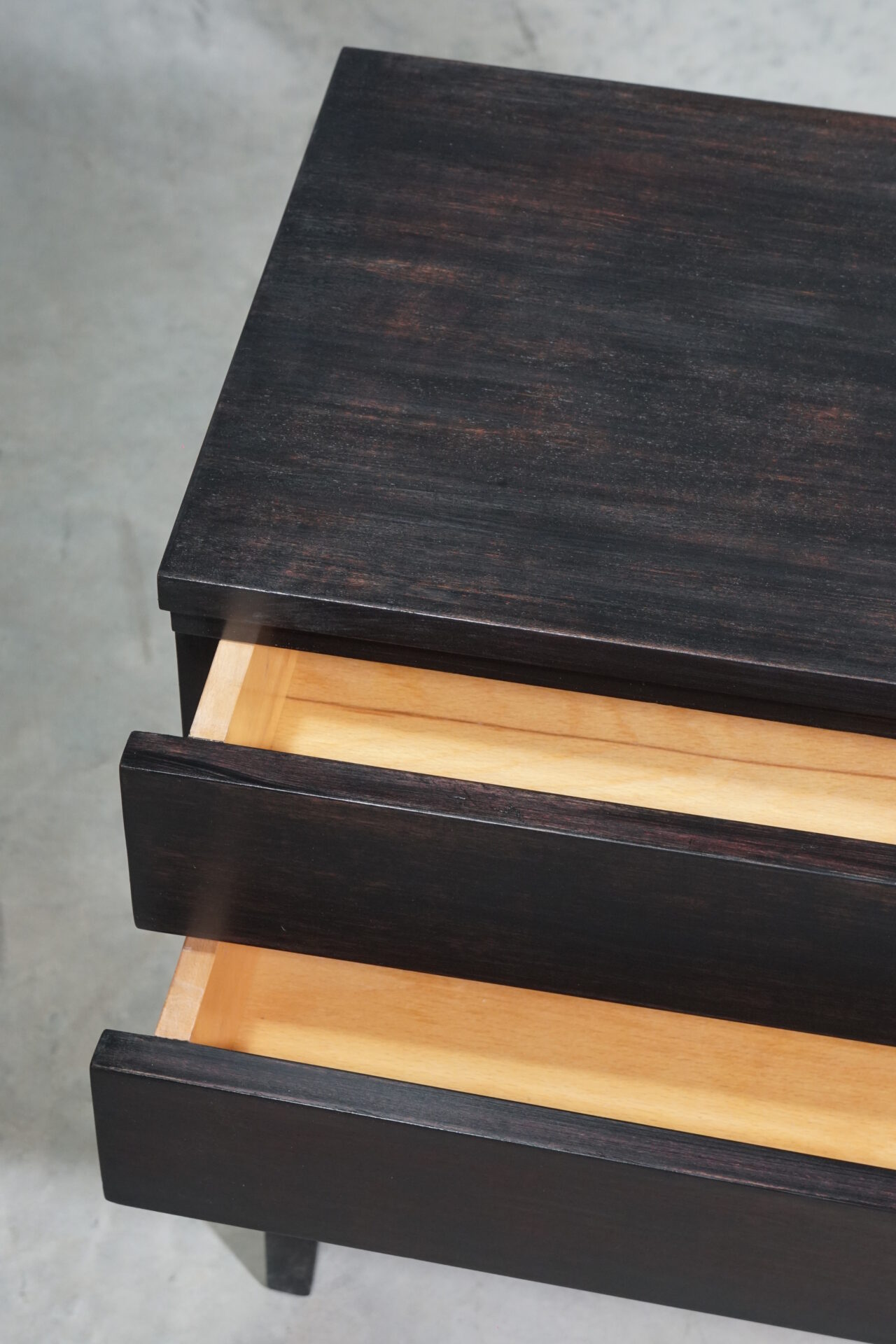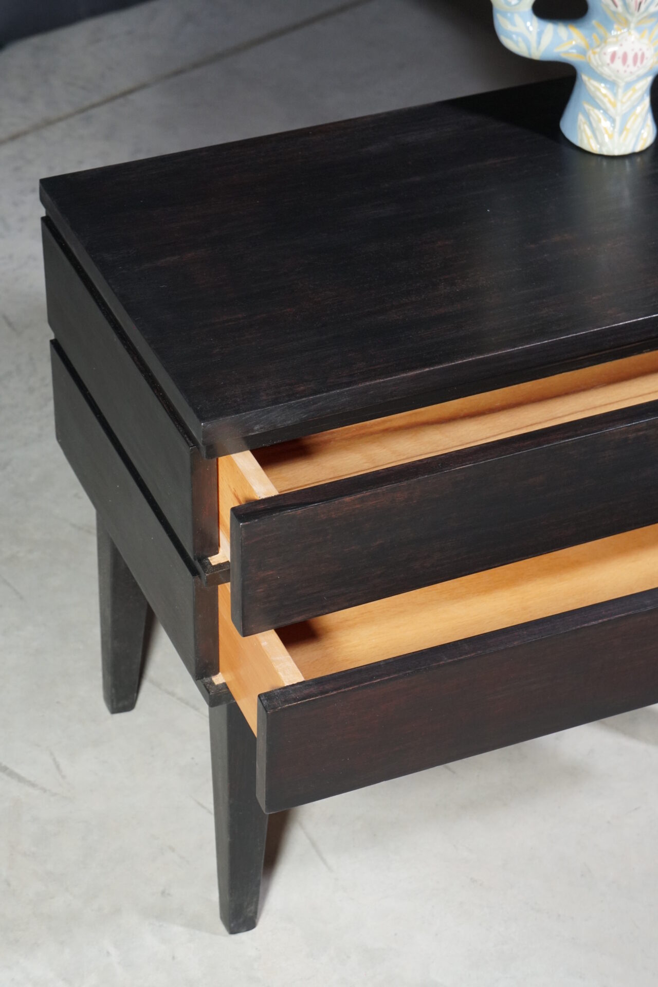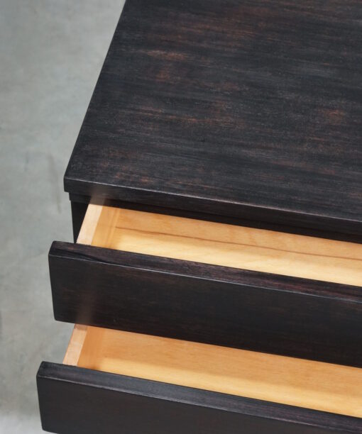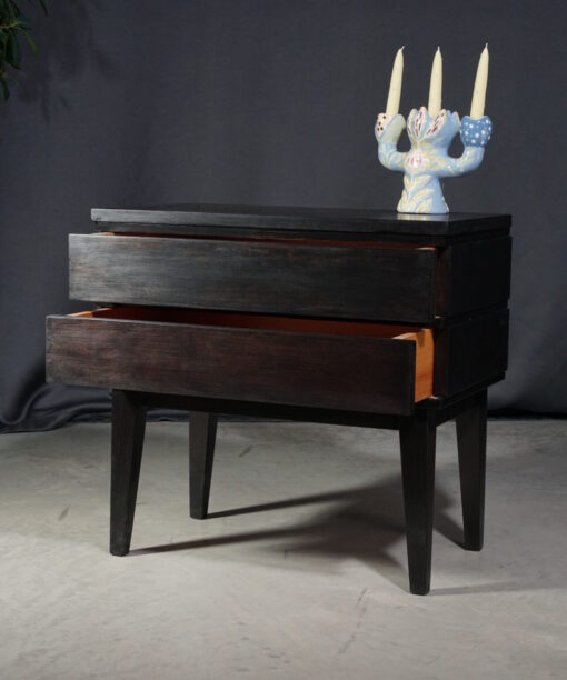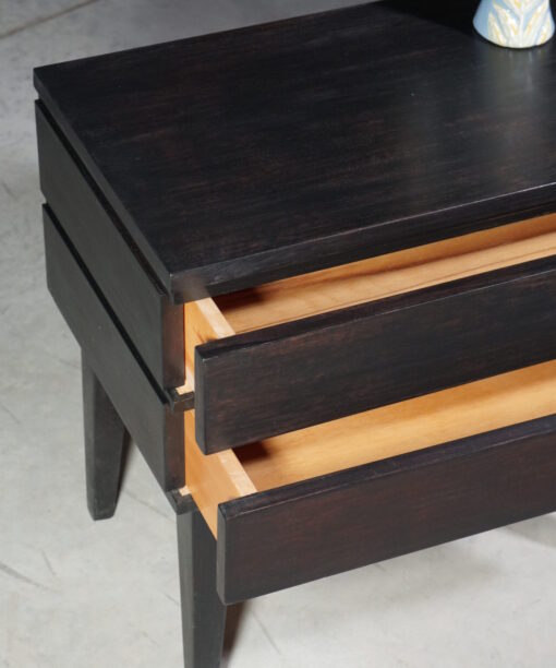 Приліжкова тумба кубічної форми з двома шухлядами темно-коричневого кольору. Всередині покрита прозорим лаком