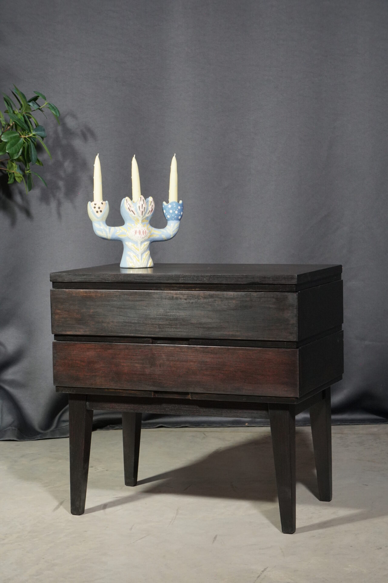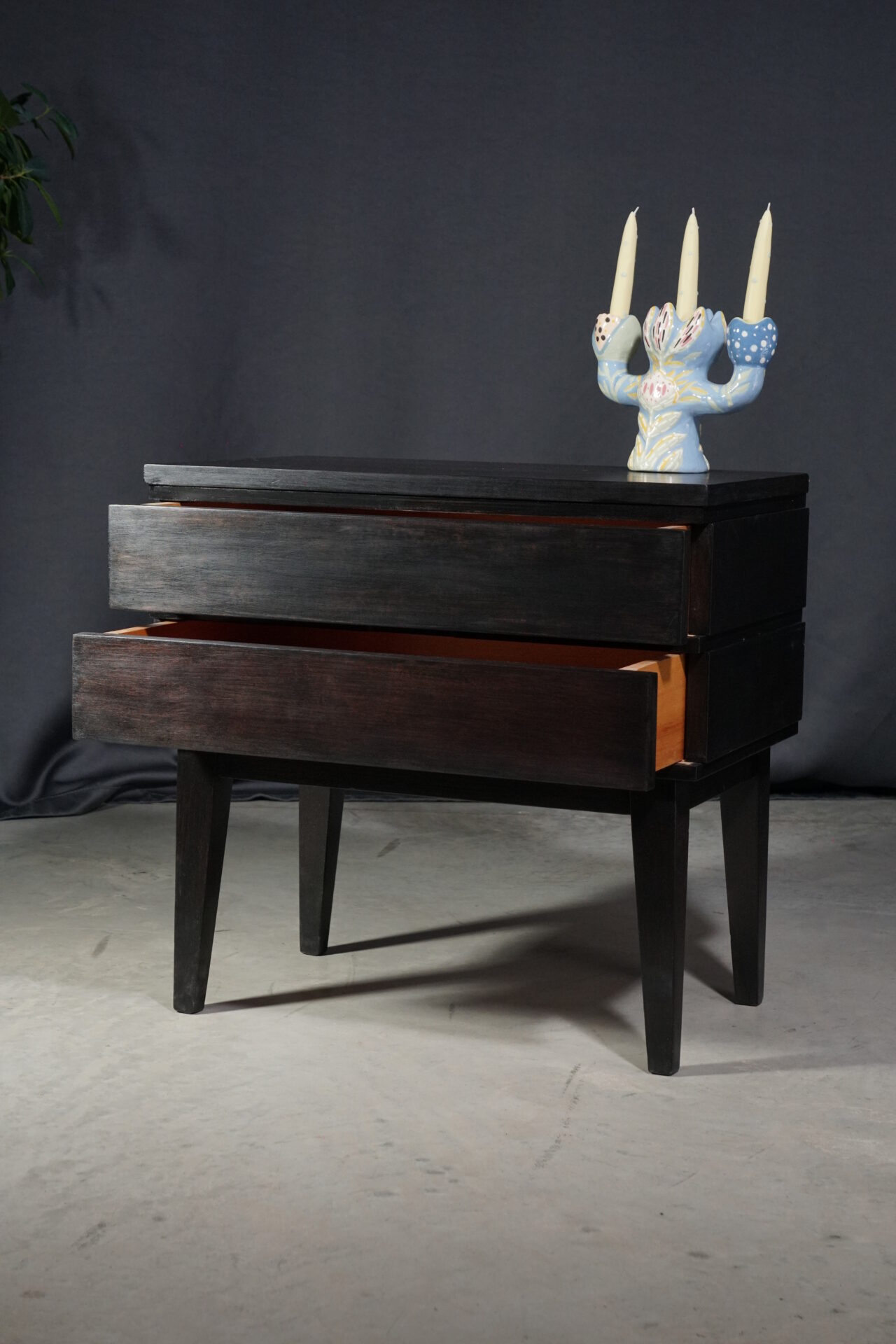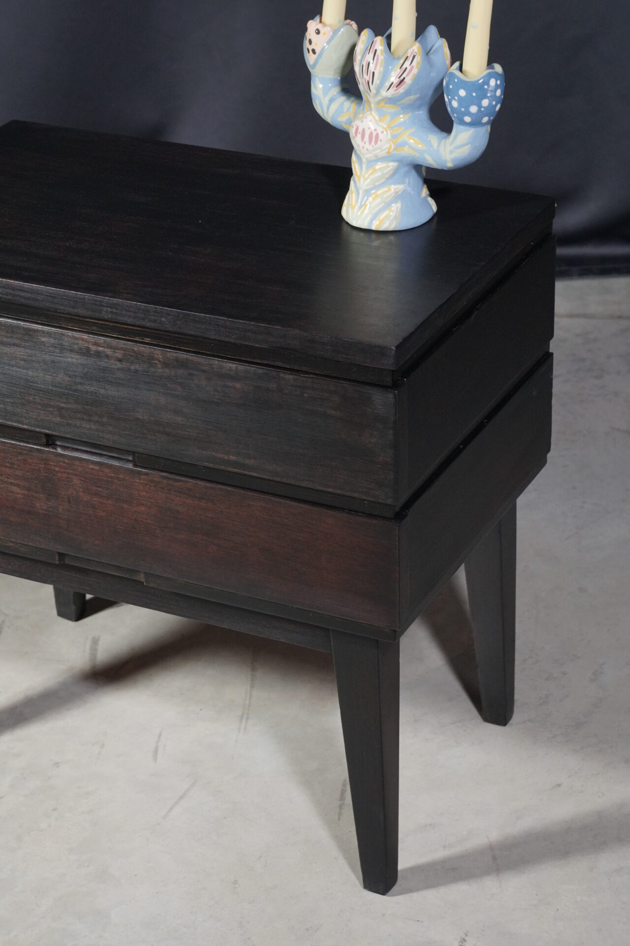 Приліжкова тумба кубічної форми з двома шухлядами темно-коричневого кольору. Всередині покрита прозорим лаком