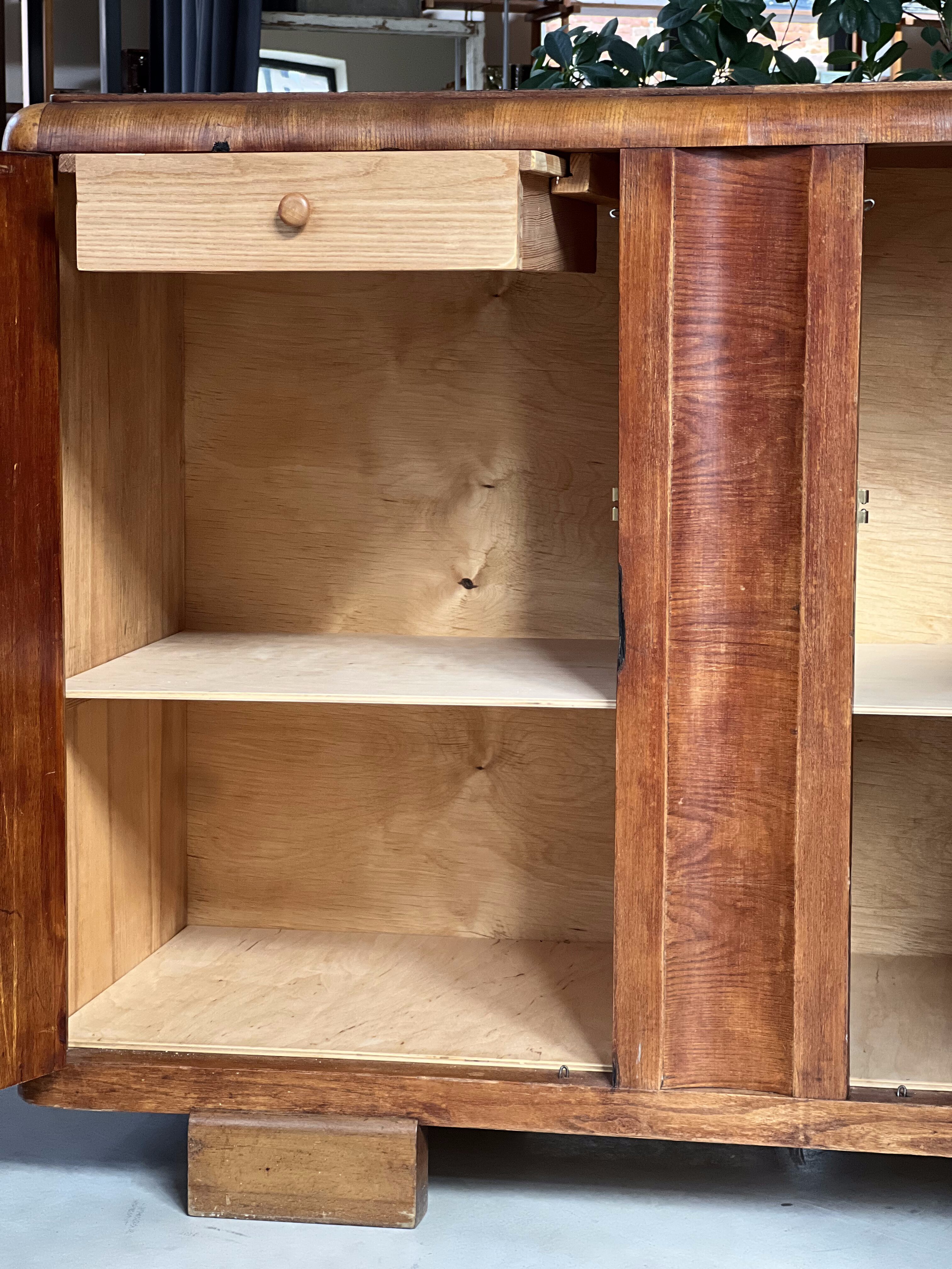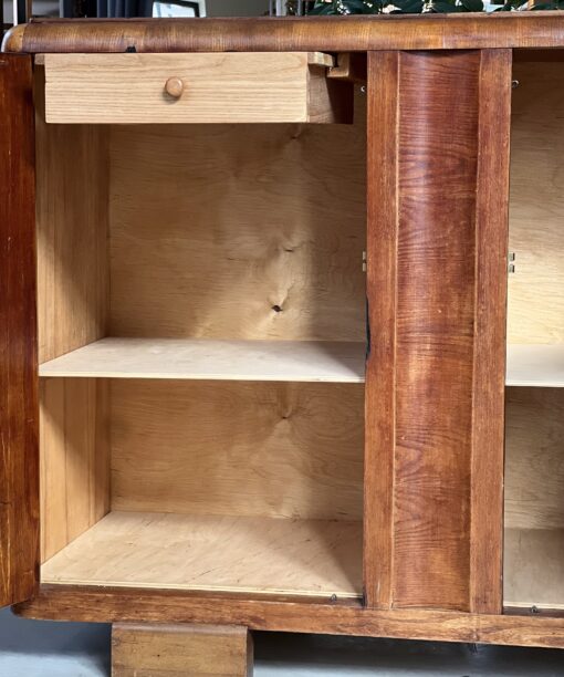 Нижня частина креденса перетворилась на тумбу. Масивні ніжки, заокруглени кути - впізнавані елементи меблів середини минулого століття. Шпон ми лагідно почистили від старого лаку, покрили професійною олією, а часткові втрати, які не впливають на функціональність, підкреслили чорною фарбою, додавши тумбі брутальності.