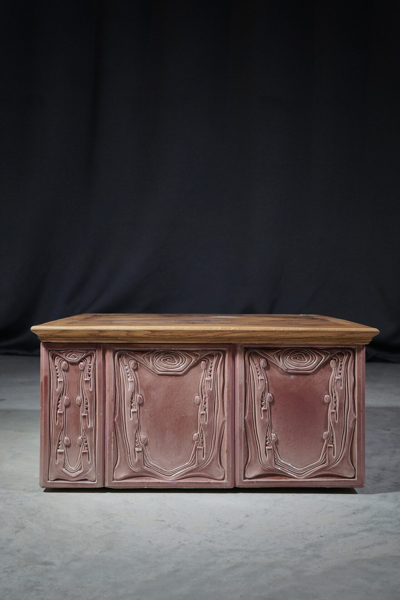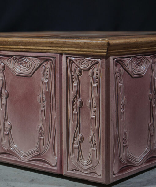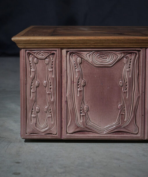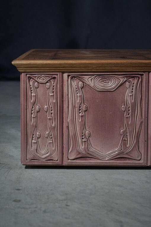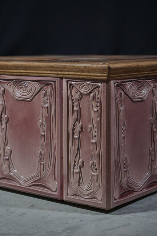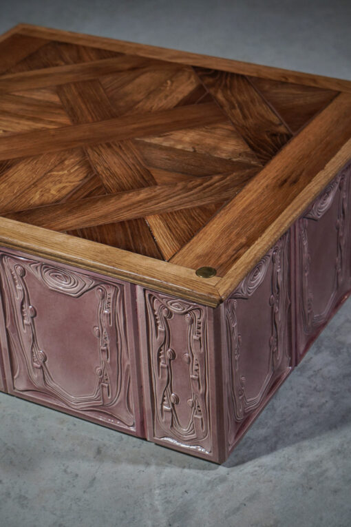 Журнальний столик виконаний з рожевих ар-декових кахлів, яким понад 100 років та дубового паркету такогож віку. Стільниця прямокутного розміру, має естетичний плінтус- перехід до стінок кахлів. Стільниця виконана з великого дубового паркетного щита, реставрованого, покритого прозорою олією Borma Wachs. Столик на колесиках для зручного пересування.